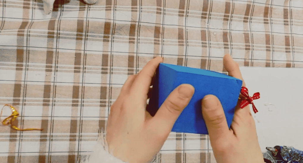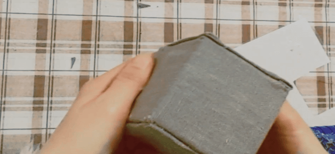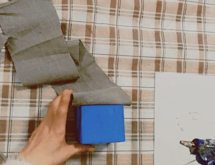 2. 천이나 종이 등을 이용해 준비해둔 정사각형 통을 감싸줍니다. 우선 4면을 감싸주세요. 저는 자투리 천이 있어서 사용했습니다.